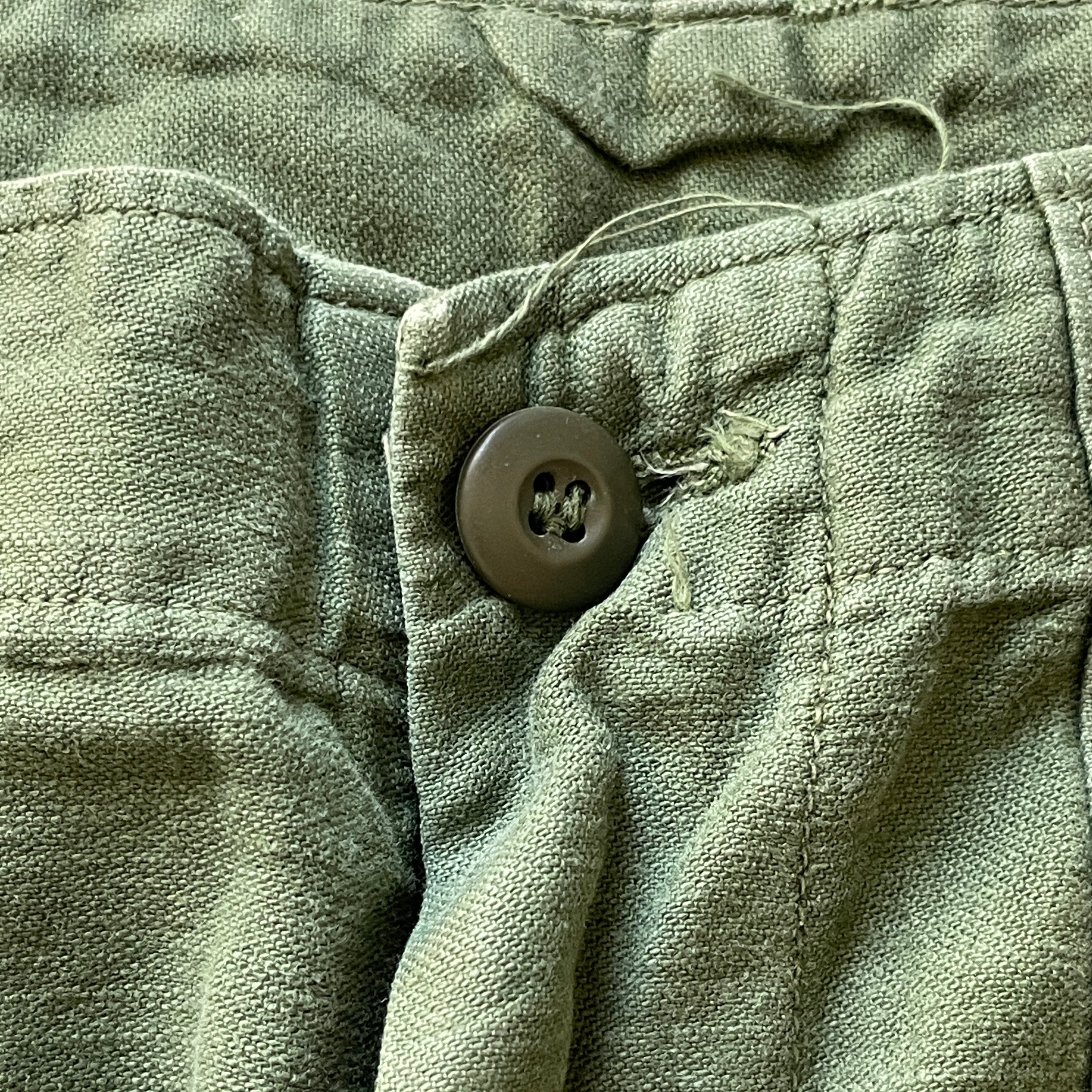 そして、今回はその中でもトップクラスに球数の少ないOG107ベイカーパンツを仕入れました。このパンツは、朝鮮戦争からベトナム戦争の初期まで使用されたと言われています。その意味では、モッズコートと言われるM51と同期です。おそらく、M51カーゴパンツは戦闘向け、OG107ベイカーパンツは作業着用として、使い分けられていたのかと。