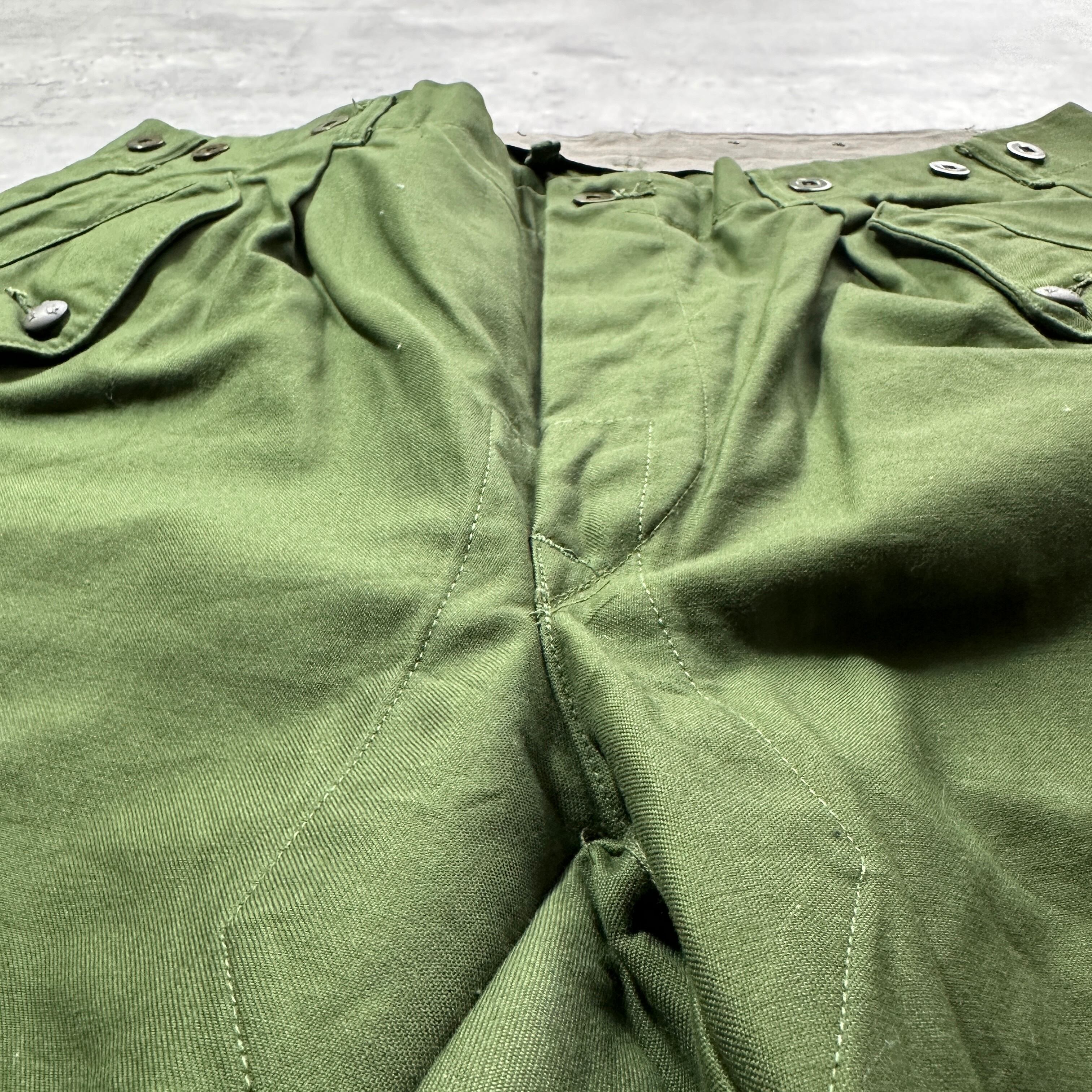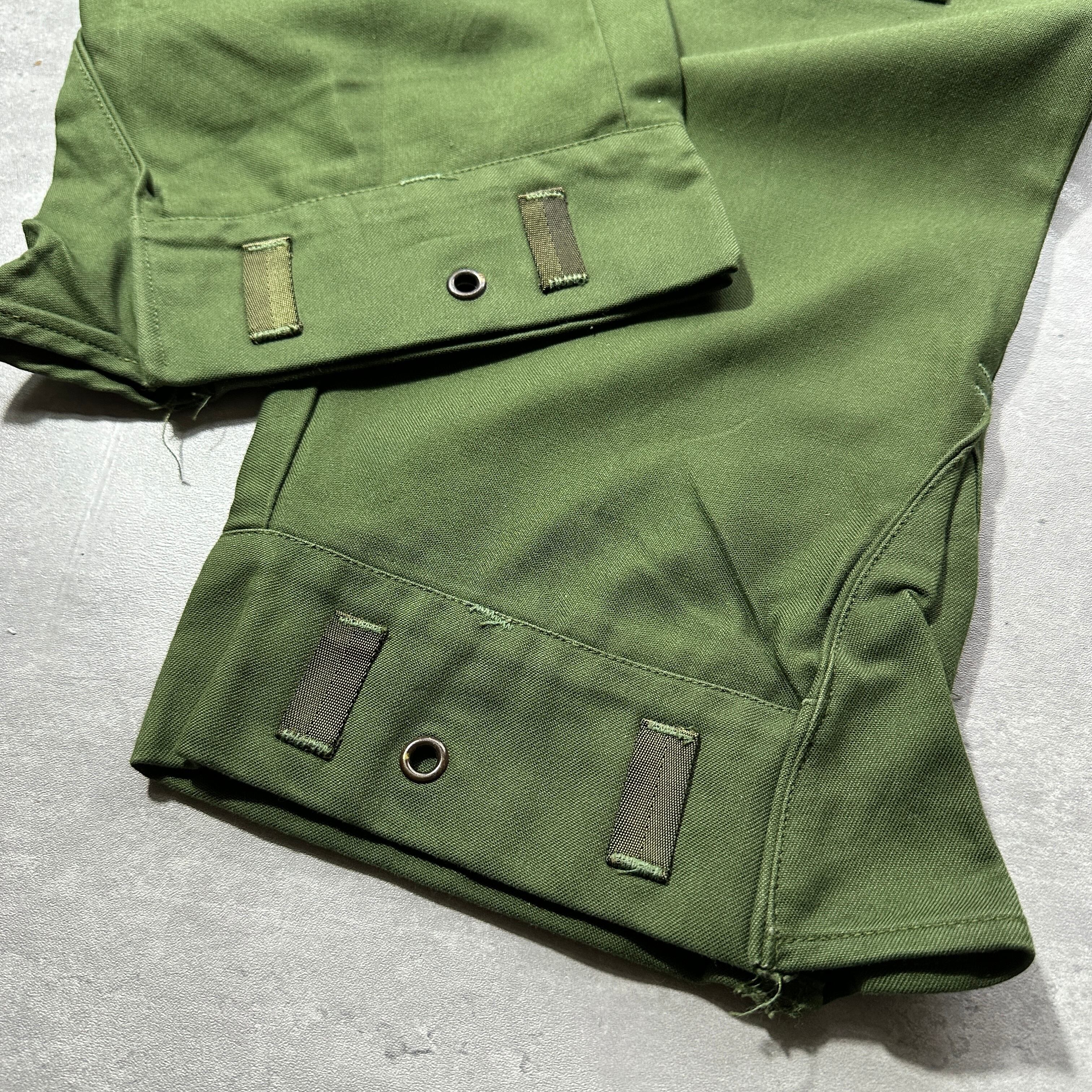 コットン素材でありながら、高密度に織り込まれた生地は、厳しい北欧の寒さや風をしっかりと防ぐ作りとなっております。また、無骨で実用的なフラップポケットや裾のストラップは、戦場での使用を想定した機能性の名残です。